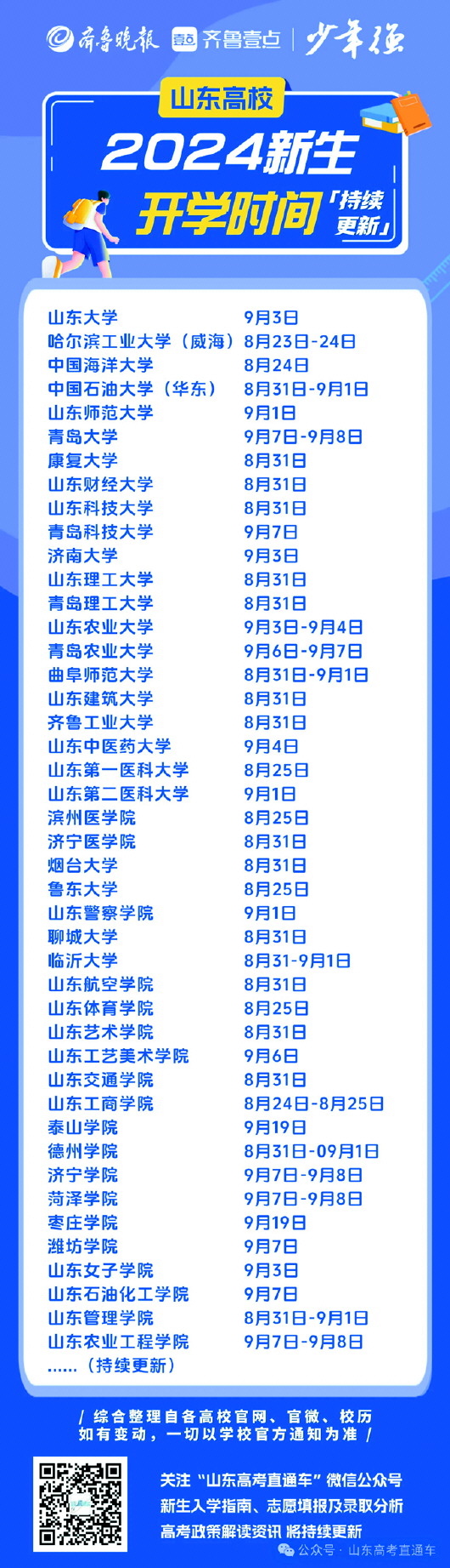 山东师范大学、山东第二医科大学、山东警察学院、齐鲁师范学院等高校的新生将于9月1日报到。山东大学2024级新生报到的时间是9月3日,不过,学校自9月2日12时便开始接站。